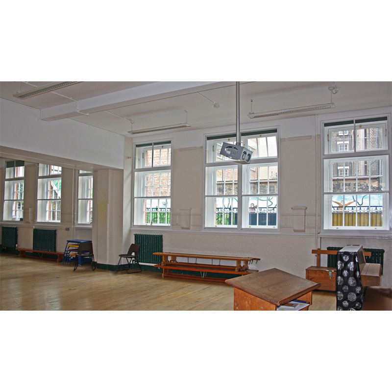 Main hall at St Josephs school with secondary glazing window treatments for sound insulation
