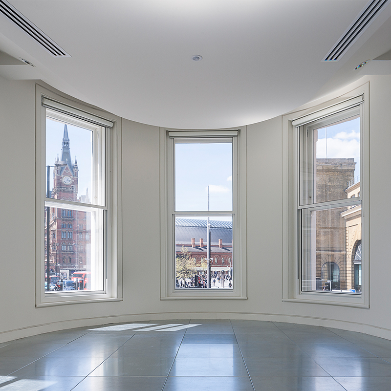 The decoupling of the primary from the secondary glazing also ensures that ingress from the three very busy roads that encircle the building is almost completely deadened. With a gap of at least 100mm between the two panes of glass and high performance seals means a reduction of 50dB can be achieved.
