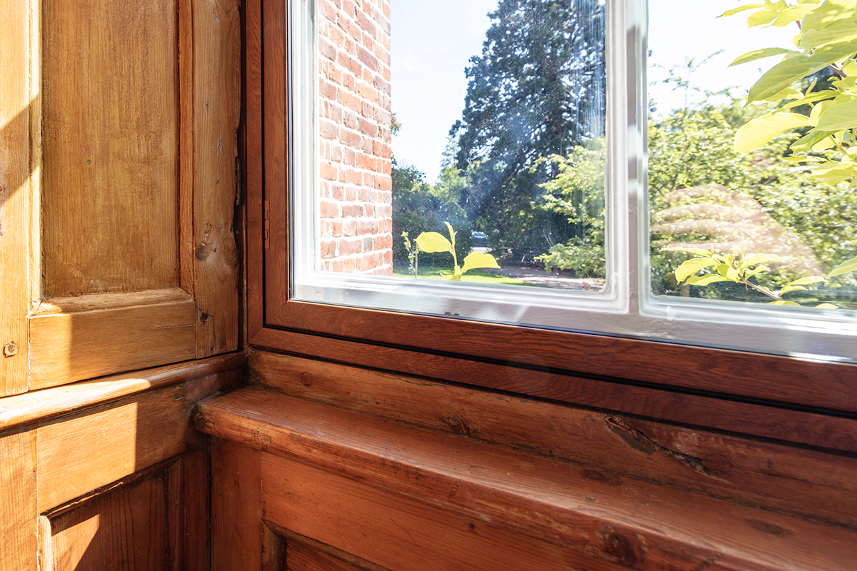 22 windows have been treated using a number of window styles: fixed light, vertical sliding and side-hung casements. Two windows in the wood-panelled room were treated with the Series 47 hinged casement system which was able to sit tight behind the wooden shutters, allowing their continued operation. The aluminium profiles were coloured in a woodgrain finish which colour matched the existing surrounds perfectly.